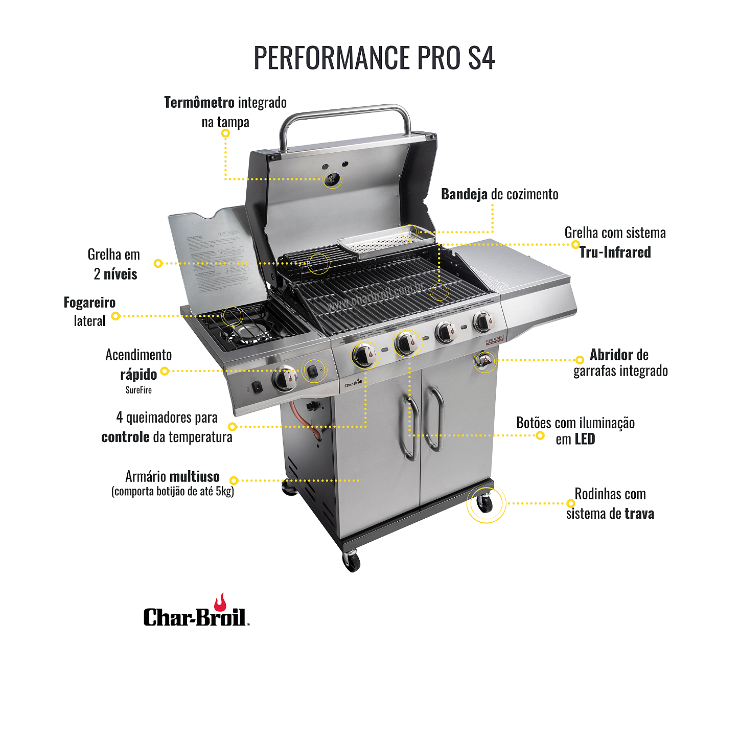 ‣ A Char-Broil Perferormance Pro S4 é a churrasqueira a gás mais completa da marca. Equipada com 4 queimadores principais e 1 selador lateral, é a churrasqueira ideal para quem gosta de praticidade. Com um design moderno e elegante o seu churrasco começa com o simples apertar de um botão com a ignição eletrônica SureFire. Basta aguardar alguns minutos e a sua churrasqueira estará pronta para o uso.