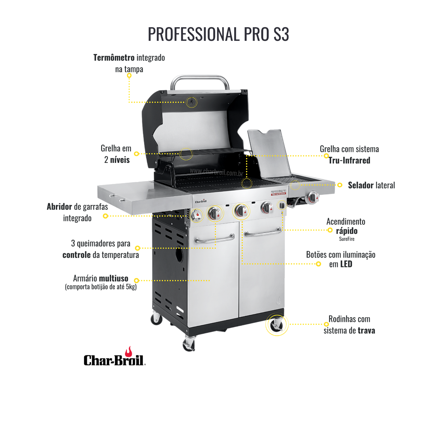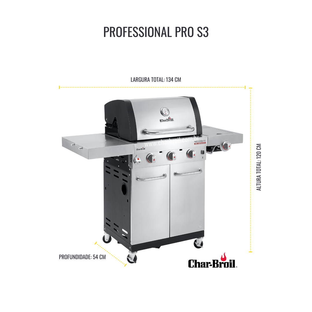 ‣ A Char-Broil Professional Pro S3 é a churrasqueira a gás mais completa da marca. Equipada com 3 queimadores principais e 1 selador lateral, é a churrasqueira ideal para quem gosta de praticidade. Com um design moderno e elegante o seu churrasco começa com o simples apertar de um botão com a ignição eletrônica SureFire. Basta aguardar alguns minutos e a sua churrasqueira estará pronta para o uso.