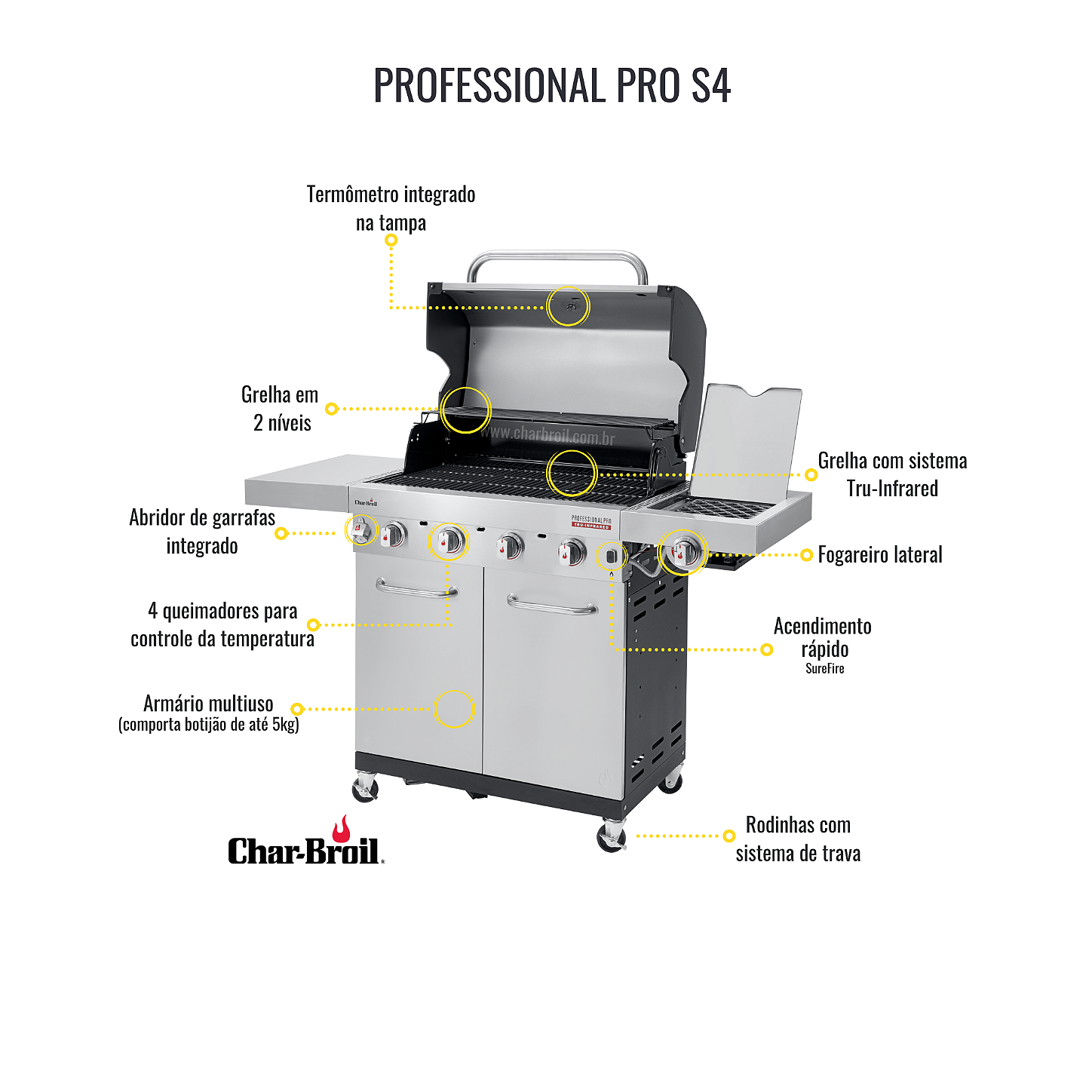 ‣ A Char-Broil Professional Pro S4 é a churrasqueira a gás mais completa da marca. Equipada com 4 queimadores principais e 1 selador lateral, é a churrasqueira ideal para quem gosta de praticidade. Com um design moderno e elegante o seu churrasco começa com o simples apertar de um botão com a ignição eletrônica SureFire. Basta aguardar alguns minutos e a sua churrasqueira estará pronta para o uso.