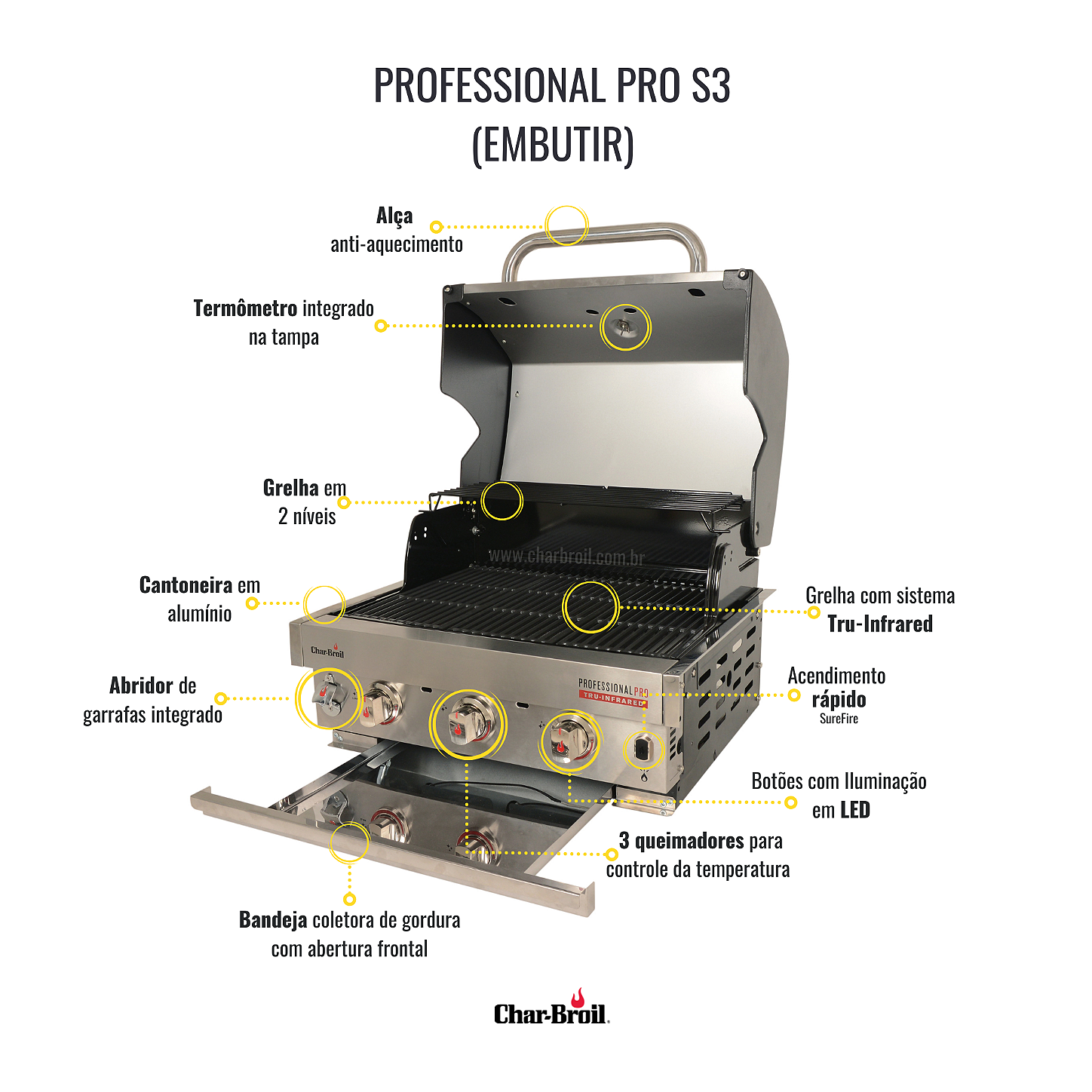 Construída em aço inox, a Professional Pro S3 de embutir possui benefícios e qualidades que você só encontra na Char-Broil, pois além de proporcionar um churrasco de qualidade, ela irá decorar o seu ambiente, deixando sua área gourmet muito mais charmosa e elegante. Fazer churrasco nunca foi tão fácil!