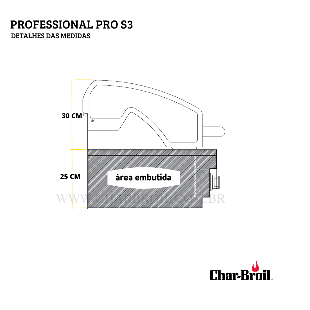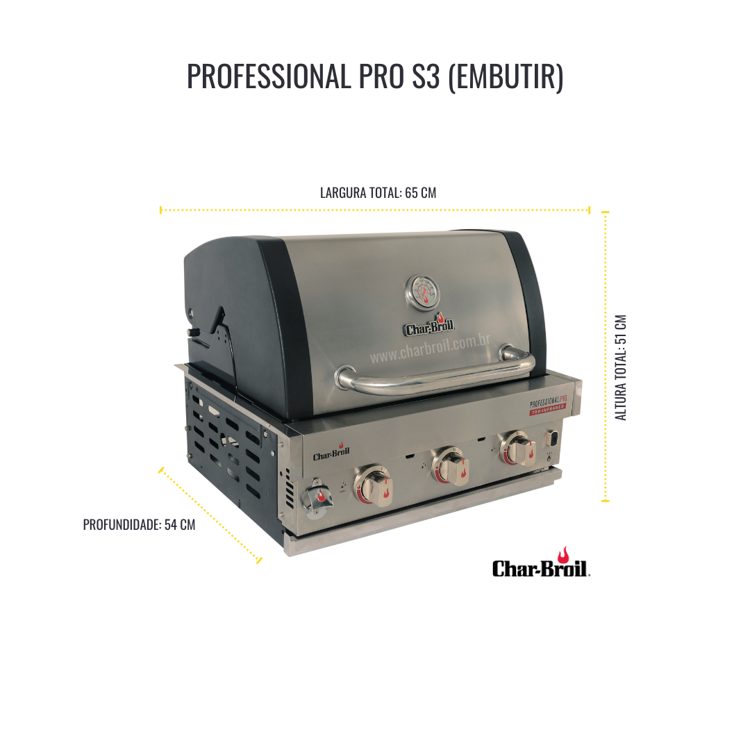 ‣ A Char-Broil Professional Pro S3 para embutir é a churrasqueira a gás mais completa da marca. Equipada com 3 queimadores, é a churrasqueira ideal para quem gosta de praticidade. Com um design moderno e elegante o seu churrasco começa com o simples apertar de um botão com a ignição eletrônica SureFire. Basta aguardar alguns minutos e a sua churrasqueira estará pronta para o uso.